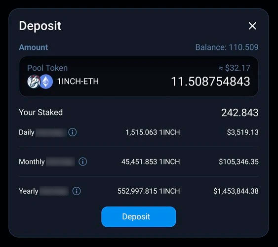 | Объединения | APY за предоставление в пул | APY фарминга 1 Inch | APY добычи 2-й монеты в паре |