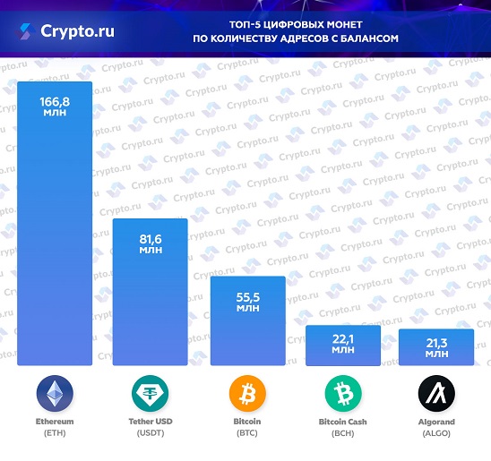 В лидеры со значительным отрывом вырвался главный альткоин — Ethereum (ETH). Сейчас в сети находятся 166,8 млн адресов, которые имеют на счете определенное количество монет.