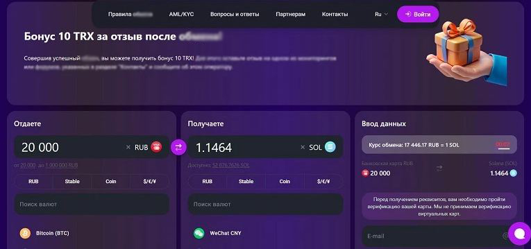 Всем клиентам предлагается бонус в 10 TRX за отзыв о платформе после успешного обмена. Оставить комментарий необходимо на одном из популярных мониторингов или форумов, список которых менеджеры сервиса указали в разделе «Контакты». Когда клиент опубликует отзыв, ему следует написать в службу поддержки, предоставив скриншот. Затем можно будет получить вознаграждение на свой кошелек.