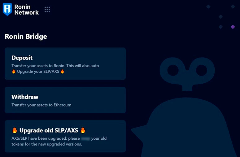 - С комиссией через Ronin Bridge (кроссчейн-мост между основной сетью ETH и сайдчейном), переведя монеты с кошелька Metemask. При этом на счет поступит аналог — Wrapped Ethereum (WETH).