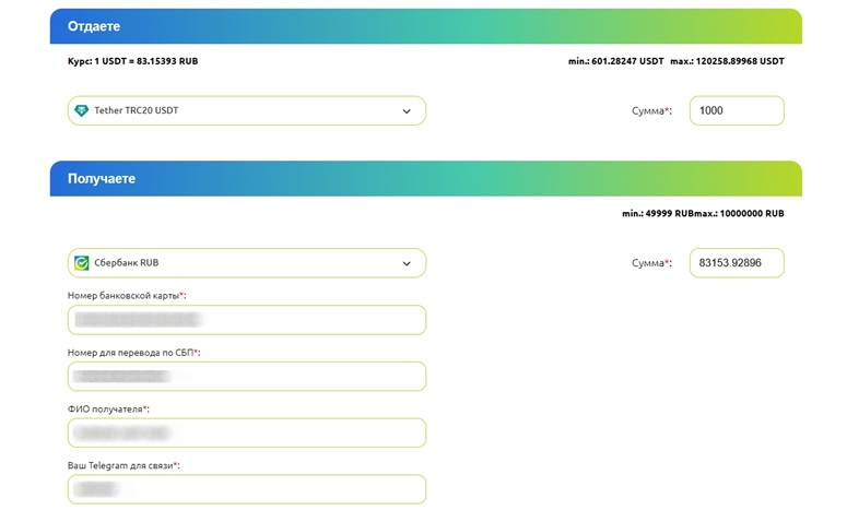 После ввода данных необходимо нажать на кнопку «Продолжить», чтобы перейти на следующий этап. Откроется страница для создания заявки с пустыми полями, которые пользователь должен заполнить. Они зависят от выбранной платежной системы. Например, для вывода через СБП необходимо указать банк, номер перевода, ФИО и Telegram для связи. Для получения оплаты наличными достаточно ввести адрес (для AML-проверки) и Telegram.