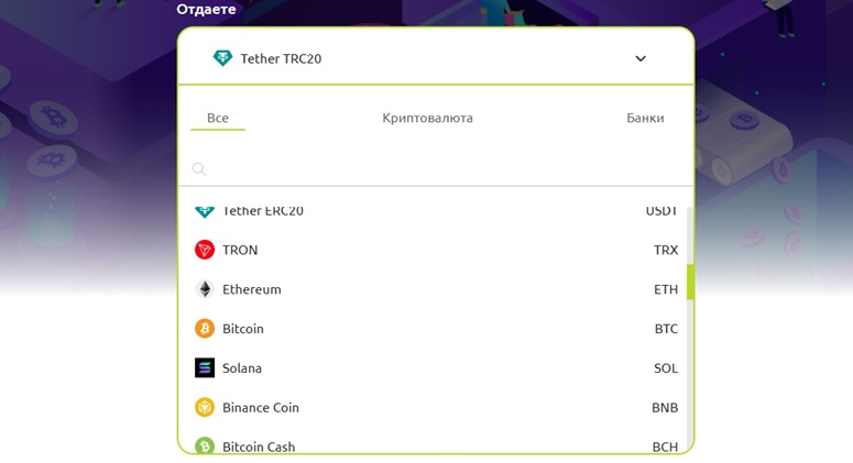 Если интересует продажа криптовалюты, список доступных направлений обмена дополняется множеством вариантов: Solana, Toncoin, Dai, Dogecoin, TRON, Ethereum, Bitcoin, Binance Coin, Bitcoin Cash, Arbitrum, Avalanche, Chainlink, Sui, Litecoin, Monero, Ripple, Zcash, Cardano, Dash.