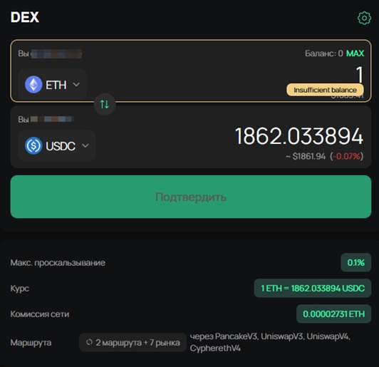 Некастодиальный сервис сканирует несколько источников ликвидности (DEX) и путей смарт-контрактов, чтобы направить транзакцию по наиболее эффективному маршруту. Эту информацию можно увидеть при оформлении сделки.