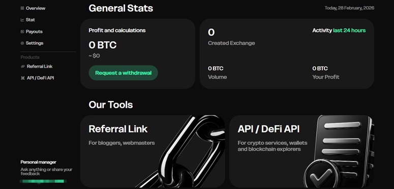 Учетная запись готова к работе. Наряду с партнерской активностью здесь можно отслеживать историю обменных сделок. На странице статистики они разделены по вкладкам Cross-Chain и DeFi.