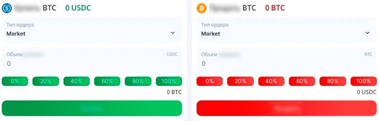 - Указать объем криптовалюты для покупки (продажи). Можно нажать одну из кнопок внизу поля («10%», «20%» и другие). Алгоритм использует для сделки определенный процент депозита.