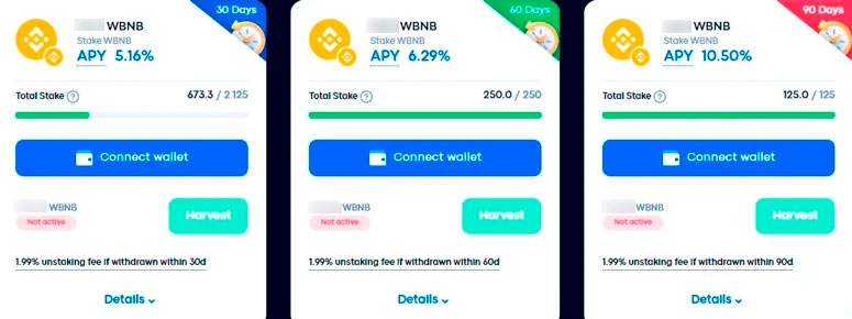 В стейкинге можно заработать до 19% годовых. Процентная ставка фиксирована на весь срок блокировки (до 90 дней). Стейкинг на платформе Biswap имеет следующие особенности: