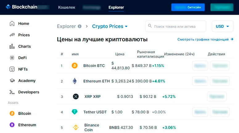 На сайте предложен раздел Prices. В нем также можно отслеживать цены криптовалют. Выводится информация по рыночной капитализации и суточному изменению курса. Там же есть кнопки «Купить» и «Торговля» для перехода на биржу.