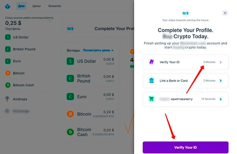 Чтобы приступить к верификации, нужно на главной странице внутри аккаунта нажать на кнопку «Начать». Тогда всплывет форма. В ней нужно перейти по кнопке Verify Your ID.