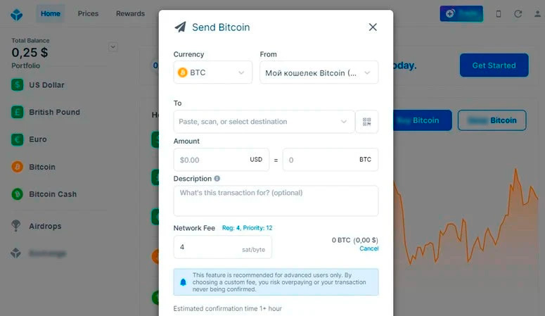 При отправке криптовалюты размер комиссии определяется по умолчанию. Однако у клиентов есть возможность самостоятельно установить значения. К примеру, чтобы майнеры быстрее добавили транзакцию в мемпул, необходимо увеличить комиссию. Для этого в форме нужно нажать на ссылку Customize fee. Дальше появятся поля для настройки. Однако самостоятельно указывать значения желательно только опытным держателям, чтобы не допустить ошибку.
