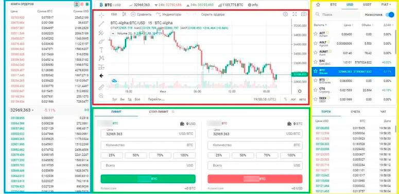 Платформа биржи состоит из стандартных блоков, необходимых для спотовых сделок. Терминал удобно разделен на 4 зоны: