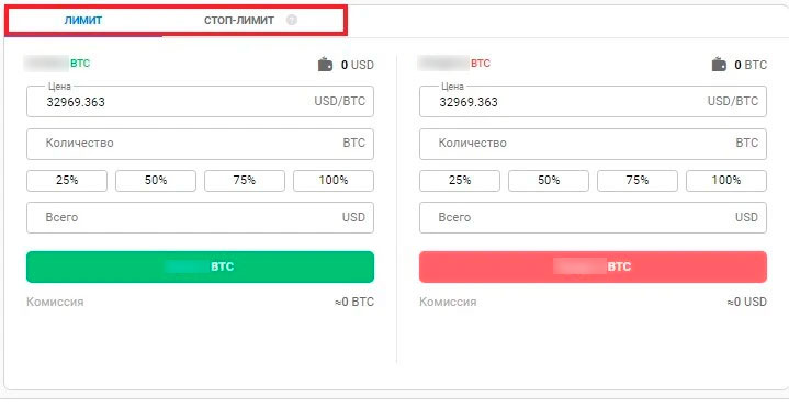 Трейдерам доступно только два типа отложенных заявок: Limit и Stop-Limit. Также можно оформить моментальную сделку по текущей рыночной котировке.