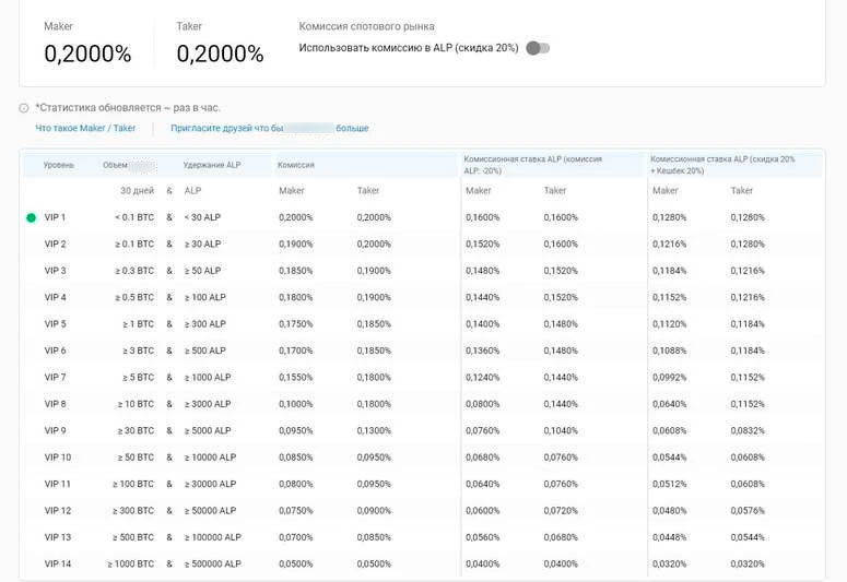 Максимальный размер торговых комиссий — 0,2%/0,2% (тейкер/мейкер). Ее можно снизить до 0,032%/0,032%. Величина тарифов платформы зависит от объема совершенных за месяц сделок и количества токенов ALP на счету. Всего есть 14 уровней комиссий: