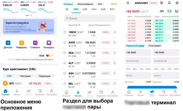 Платформа биржи для смартфонов доступна для скачивания в официальных каталогах AppStore и Google Play. Есть отдельные версии для планшетов. Приложение удобно разделено на 4 вкладки: