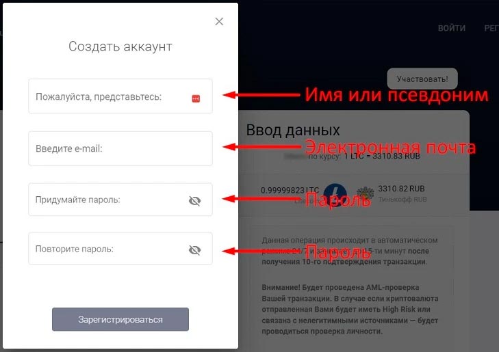 Алгоритм регистрации учетной записи (для обзора обменника):