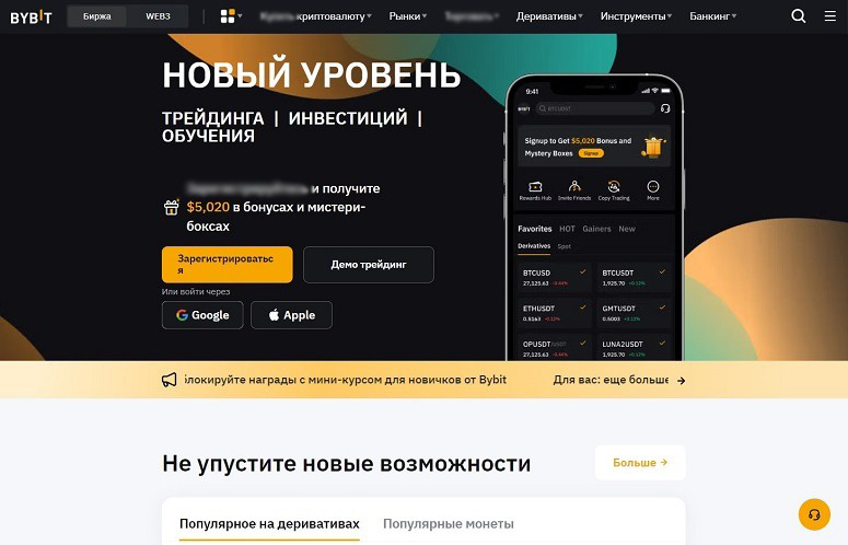 Это крупная международная криптовалютная платформа для обмена цифровых активов. Она предлагает множество различных услуг и возможностей. При этом в РФ на апрель 2024 года практически весь функционал доступен без ограничений. На бирже Bybit для россиян есть:
