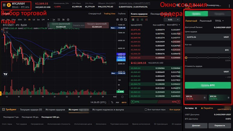 Для обмена криптовалют на бирже Bybit предусмотрен специальный терминал. Чтобы перейти в него, нужно навести курсор мыши на пункт «Торговать» и выбрать раздел «Спотовая торговля». Клиента автоматически перебросит на страницу покупки и продажи BTC за USDT. Выбрать другую криптовалюту можно в левом верхнем углу. Инструкция по торговле на примере покупки биткоинов в паре BTC/USDT: