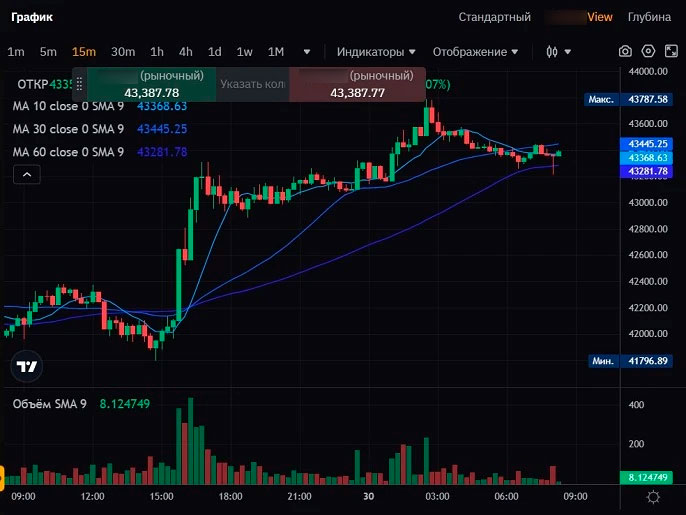 - График. Занимает левую половину экрана. По умолчанию отображается базовая версия графика. В расширенном режиме доступны индикаторы технического анализа и диаграмма с глубиной рынка (соотношением длинных и коротких позиций).