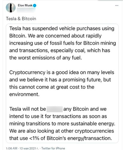 Много информационного шума возникло вокруг использования вида энергии при биткоинов. Глава Tesla, Inc. Илон Маск стал инициатором обсуждения этого вопроса. В марте предприниматель написал в своем аккаунте в Твиттере: «Теперь вы можете купить Tesla за биткоины». Однако в мае эта практика была приостановлена из-за опасений, что добыча Bitcoin и транзакции в сети являются неэкологичными.