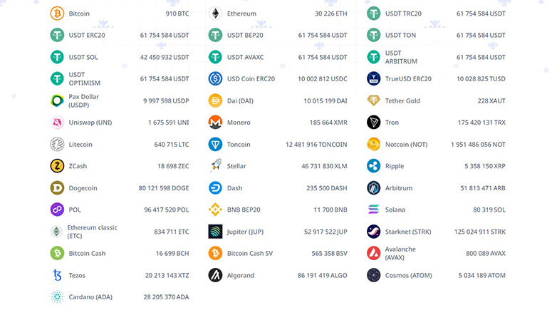 На сайте поддерживаются биткоин и большинство популярных альткоинов. Также для обмена можно использовать мем-токены. Стейблкоин USDT представлен в восьми сетях. Разнообразие позволяет экономить на комиссиях за переводы средств.