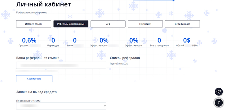 У обменника есть партнерская программа. Если привлекать по своим ссылкам новых клиентов, можно получать процент от их оборота. Для рефералов первого уровня ставка составляет 0,6%, второго — 0,2%.