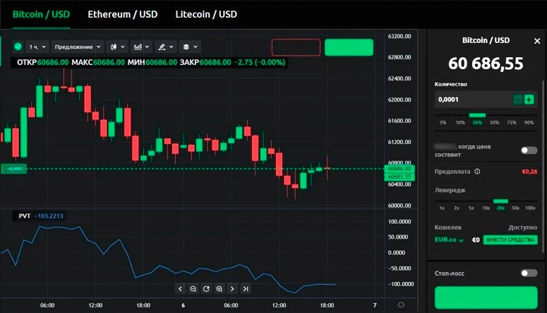 Платформа специализируется на сделках типа спот — мгновенном обмене активов. Помимо этого, пользователям доступны: