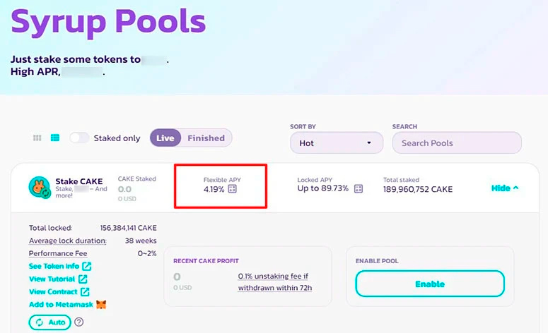 На платформе можно отправить в стейкинг только токены управления PancakeSwap. Функция доступна в разделе Syrop Pool. Годовая процентная доходность (APY) на площадке PancakeSwap в декабре 2021 года достигала около 75%. К июню 2022 года она снизилась до 4%.