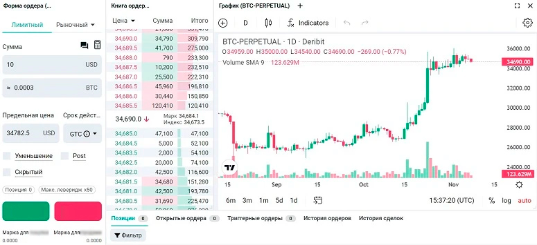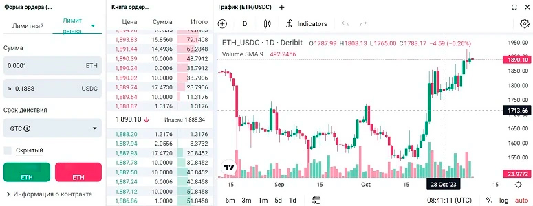 Deribit использует графическую систему TradingView, которая считается отраслевым стандартом для криптобирж. Трейдерам доступны: