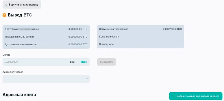 - В форме указать сумму, выбрать адрес получателя. Его нужно предварительно добавить, нажав на «+».