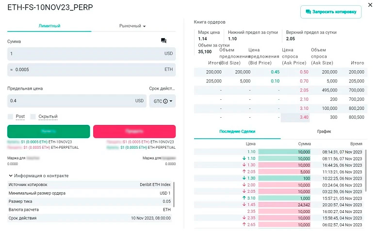 - Фьючерсный терминал. Биржа криптовалют Deribit предлагает срочные контракты на BTC, ETH и SOL. Дату экспирации можно выбрать — неделя, месяц, квартал. Бессрочные номинированы в USDC. Можно торговать фьючерсами на BTC, ETH, SOL, XRP, LTC и другие популярные монеты.