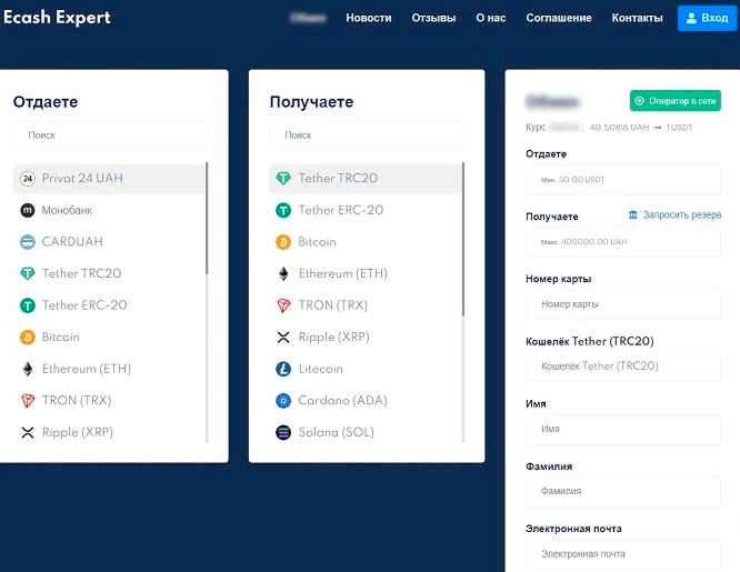 Сервис для обмена криптовалют и электронных денег ориентирован на жителей Украины. Оформление официального сайта Ecash Expert минималистичное, навигация классическая. На главной странице находится окно для проведения транзакций. Ниже указан график работы платформы и операторов, перечислены преимущества сервиса и продублирована информация с других вкладок сайта. В шапке расположено меню с 5 разделами: