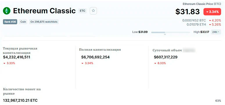 Ethereum Classic (ETC) — это криптомонета с такими особенностями (данные на июль 2021 года):