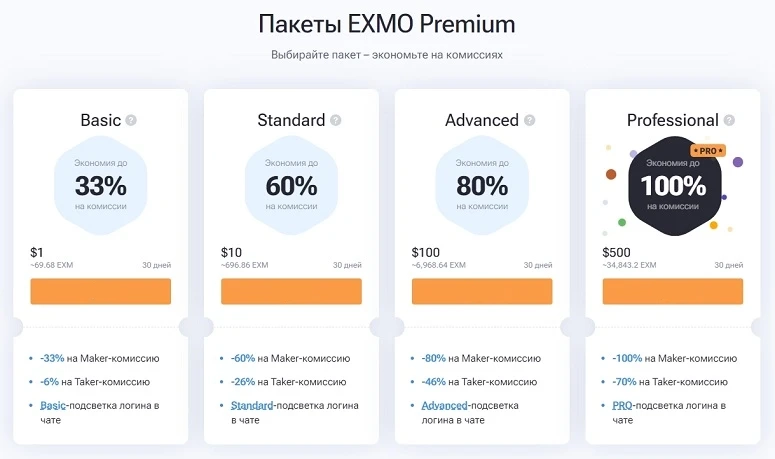 - Есть программа лояльности и пакеты EXMO Premium, снижающие торговые комиссии