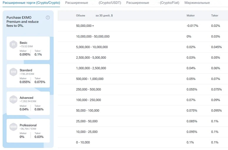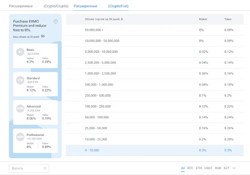 Торговые сборы зависят от подключенного пакета EXMO Premium и месячного объема торгов. Чем активнее трейдер действует на бирже, тем ниже для него комиссионные отчисления. Все расчеты проводятся за последние 30 дней.