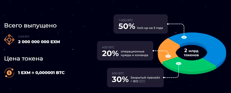 Эмиссия EXM составляет 2 млрд монет. Из них 50% подлежат сжиганию, 20% отведены на операционные нужды и оплату труда разработчиков, 30% распределяются в рамках закрытого пресейла и IEO.
