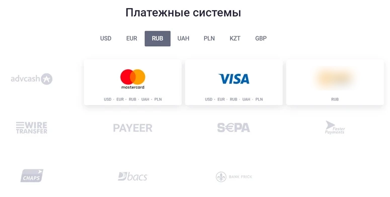 - Большой выбор платежных систем для депозита фиатом