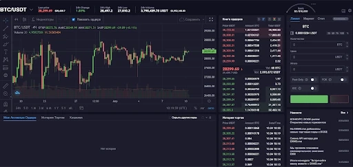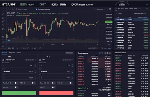 Внизу размещен блок оформления ордеров: лимиты, маркеты, стоп. Справа книга актуальных заявок и рядом с ней история действий на бирже, где отображены все заключенные сделки с указанием цены, суммы, даты и времени.