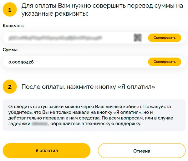 - Оплатить заявку по криптовалютному адресу или через QR-код в течение 20 минут.