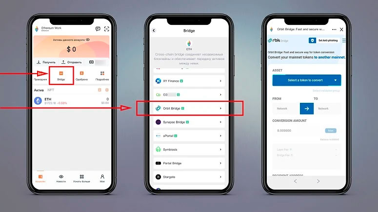 Можно выполнить межсетевой (кроссчейн) перенос с помощью bridge-решений — например, переместить криптовалюту ETH из сети Ethereum в смежную цепочку Optimism. Эта процедура также выполняется сторонними сервисами. Чтобы перевести активы по мосту, нужно кликнуть по кнопке Bridge. Она расположена на главной странице приложения. За трансфер будет удержана комиссия (gas-fee).