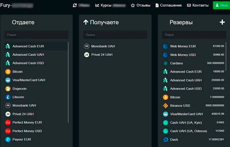 Сервис предоставляет услуги по обмену криптовалюты и электронных денег. Платформа ориентирована на граждан Украины. На главной странице официального сайта Fury Exchange пользователи могут увидеть список доступных монет и оформить заявку на их покупку. Помимо конвертера, там находятся информационные блоки: последние сделки, обменные курсы, новости.