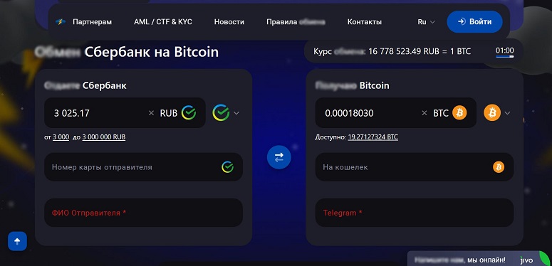 На перевод средств по реквизитам платформы пользователю по умолчанию дают 60 минут. Если за это время деньги от клиента не поступают, сервис вправе отклонить операцию. Однако обмен можно будет возобновить, обратившись в службу поддержки. | |