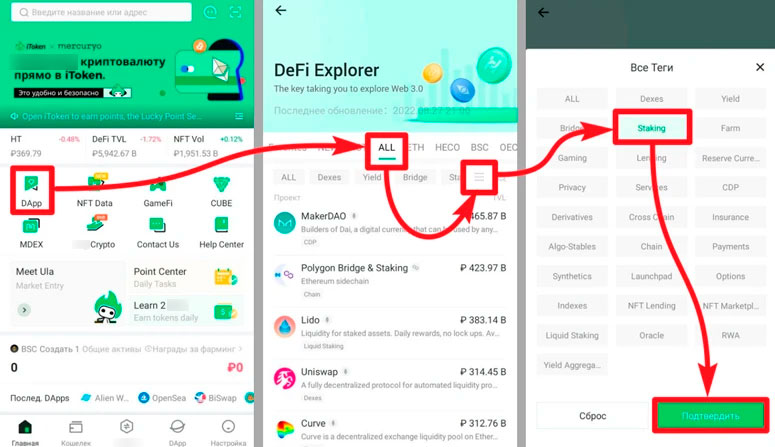 Чтобы подключиться к одному из таких проектов, нужно на главном экране выбрать иконку с надписью DApp. Откроется страница DeFi Explorer, на которой необходимо включить вкладку ALL и установить фильтр Staking. Размер и условия вознаграждений зависят от выбранного проекта.