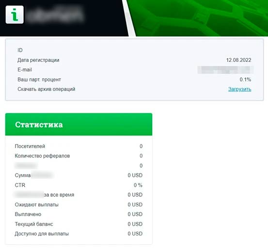 - «Партнерский аккаунт». Кабинет с отображением статистики по рефералам и выплатам.
