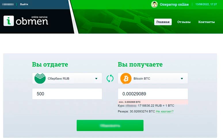 В обменнике минимальная сумма на конвертацию в рублях — 500 RUB, что эквивалентно 0,00029657 BTC.