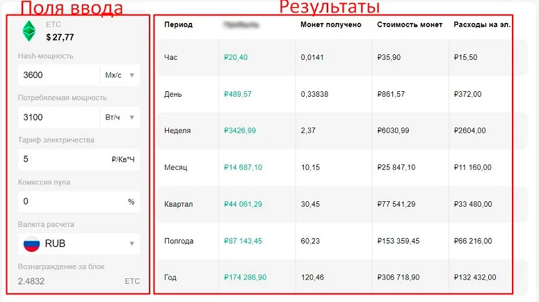 - Ввести необходимые данные. Понадобится заполнить поля «Hash-мощность», «Потребляемая мощность», «Тариф электричества», «Комиссия пула».