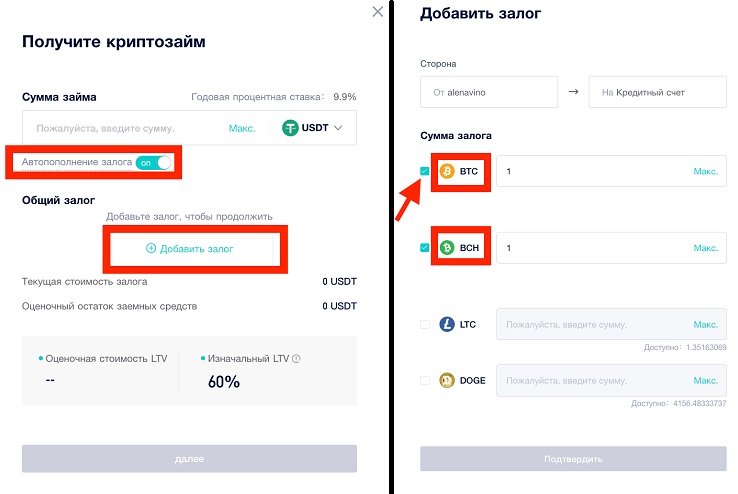 - На странице «Займы» нажать на кнопку «Занять», а затем «Добавить залог». После этого выбрать криптовалюту для залога, ввести сумму и нажать на кнопку «Подтвердить». Система поддерживает одновременное предоставление нескольких криптовалют в залог и позволяет включать или отключать «Автопополнение залога» по необходимости.