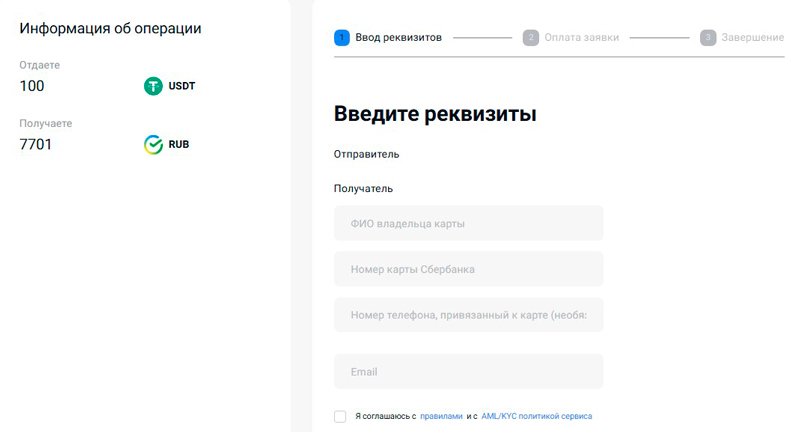 - Выбрать направление обмена — например, USDT TRC-20 на СберБанк.