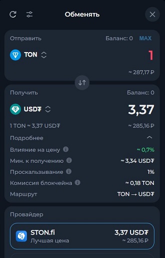 В интерфейсе Tonkeeper можно конвертировать одни криптоактивы в другие. Операции проводятся только с токенами TON. Стейблкоин USDT (TRC-20) в них не участвует.