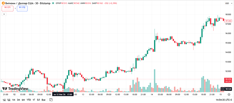 Курс одной и той же монеты может расти или падать на десятки процентов за короткое время. Волатилен даже Bitcoin — монета с крупнейшей капитализацией на рынке. Например, 12 января 2026-го его цена опускалась до $90 тыс., а уже через два дня в моменте достигала $98 тыс. Такая волатильность открывает множество возможностей для заработка на короткой и длинной дистанциях.