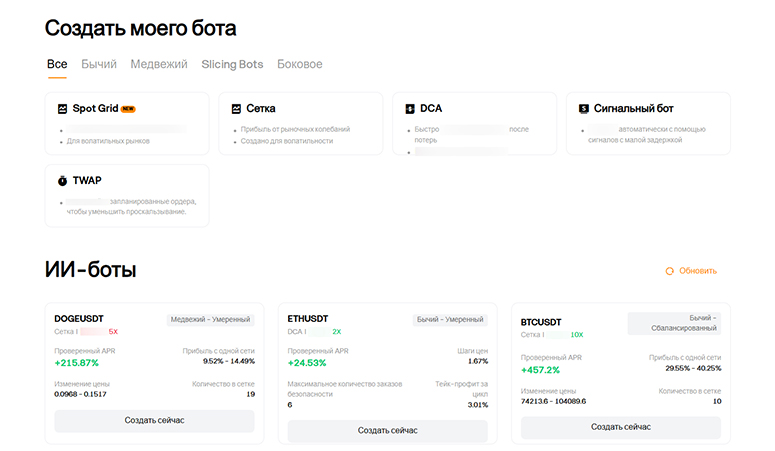 - Торговые боты. Работают по заранее заданной стратегии, которую пользователь может создать самостоятельно. Предусмотрены и готовые решения на основе искусственного интеллекта.