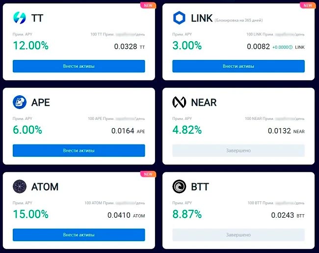 Ставки дохода зависят от продукта, актива и срока блокировки. Например, в PoS-стейкинг можно разместить 15 монет с APY 0,5-15% годовых.
